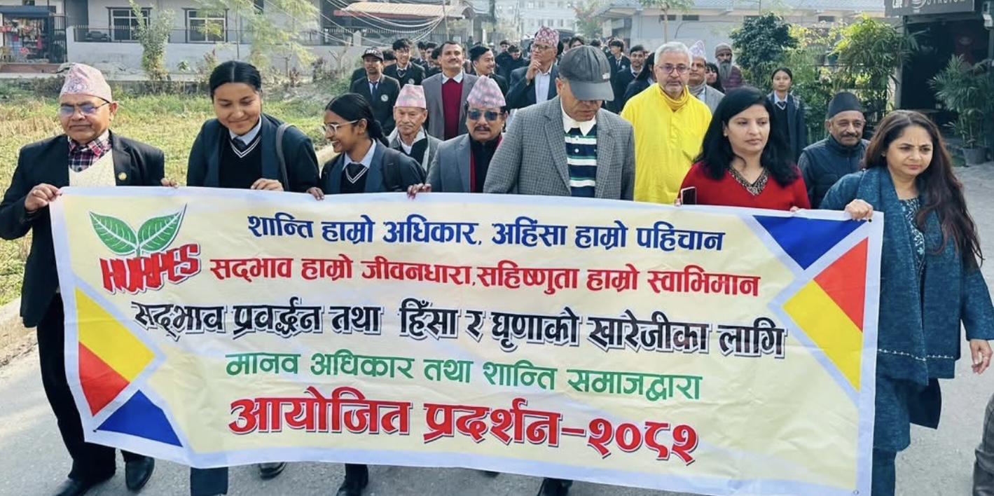 प्रदर्शनमा, समाजलाई तोड्न होईन जोड्नका लागि योगदान गरौं, समाज रुपान्तरणका लागि चालक शक्ति सदैब अहिंसा हुनुपर्छ, अराजकता होईन, हिंसा र घृणा खारेज गरौं, अहिंसा, शान्ति र सद्भाव प्रवर्द्धन गरौँ, दिगो शान्तिका लागि समुदायबीच सुमधुर सम्बन्ध अपरिहार्य, सहिष्णुता भनेको सम्मान हो, स्वीकारोक्ति हो, ग्रहणशीलता हो, बिबिधताको सराहना हो, धार्मिक सद्भाव, जातीय सद्भाव, सामाजिक सद्भाव,राजनीतिक सद्भाव, स्थायी शान्तिको आधार नै सद्भाव, सामाजिक संजालको दुरुपयोग होईन,सदुपयोग गरौँ,घृणा र प्रतिशोध मुक्त सामाजिक संजाल,सामाजिक संजाललाई भ्रामक जंजालबाट मुक्त राखौं, सम्मृद्धिका लागि हिंसामुक्त नेपाल, हिंसाको कारक बन्ने आवेग माथि नियन्त्रण गरौँ, शान्तिको जगेर्ना गर्न बिबेक प्रयोग गरौं, अफवाहको पछाडी नलागौं भरपर्दो सुचनाको श्रोतमा बिश्वास गरौँ, उत्तेजना फैलाउनु अपराध हो, जिम्मेवार भएर सामग्री सम्प्रेषण गरौँ सामाजिक संजाल लगायत सूचना प्रविधिको बिबेक सम्मत प्रयोग गरौँ लेखिएका प्लेकार्डहरु प्रदर्शन गरिएको थियो ।